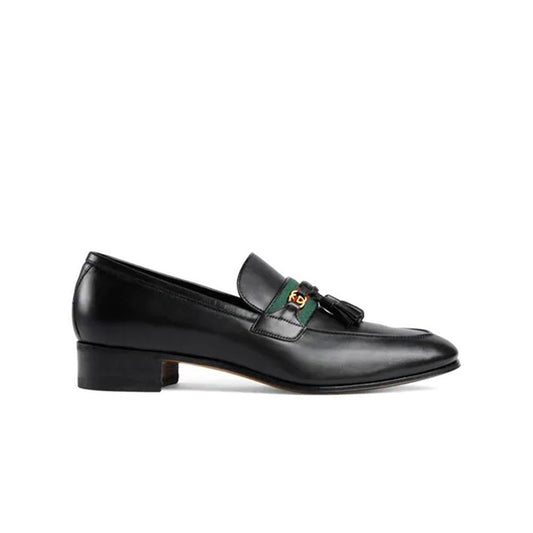 Gucci 624720 1066 Men's Shoes Black Calf-Skin Leather with Web and Interlocking G Tassels Loafers (GGM1721)