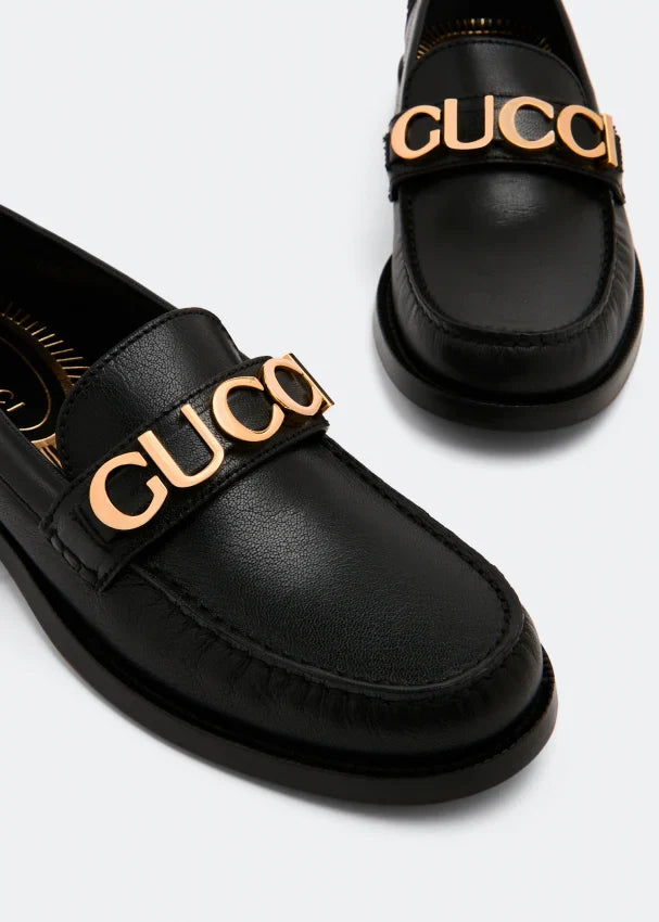 The Gucci women's shoes are black leather loafers that exemplify the brand's commitment to luxury and style. These loafers are crafted from premium black leather and feature the iconic Gucci logo prominently displayed on the upper, adding a distinctive touch to the classic design. The slip-on style ensures ease of wear, while the durable leather sole provides comfort and longevity.​